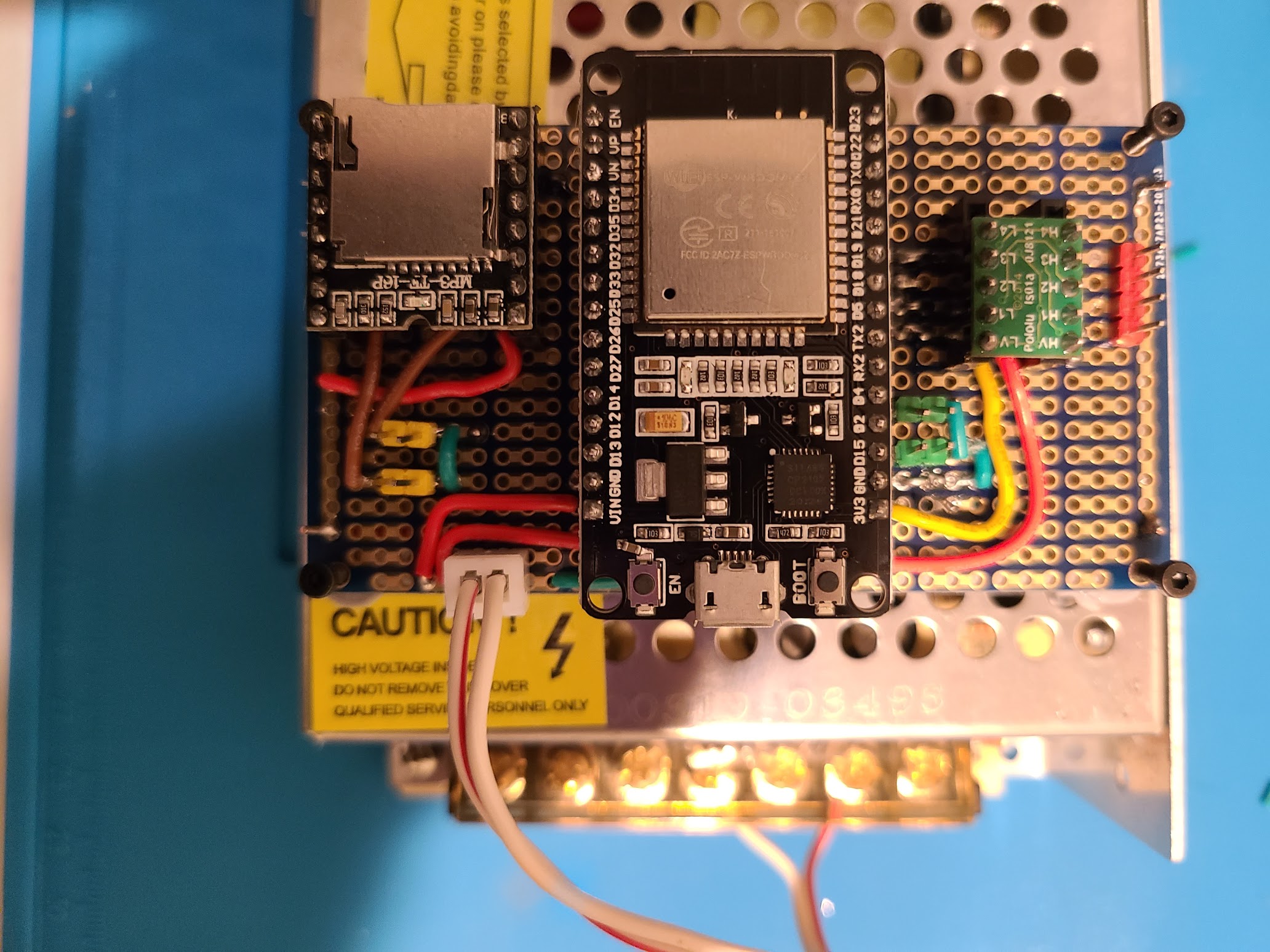 • Common ground between the ESP32, LEDs, DFPlayer, and amplifier.